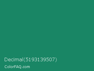 Decimal 5193139507 Color is a normal green color and the nearest color is Deep Green Cyan Turquoise #0e7c61. Hex code #198665 and RGB value is rgb(25,134,101). In RGB color space, this color is composed of 10% red, 53% green, 40% blue, In CMYK color space, this color is composed of 81% cyan, 0% magenta, 25% yellow , 47% black , In HSL color space, this color has a hue angle of 162° , 69% saturation and 31% lightness.