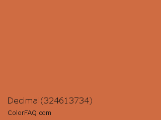 Decimal 324613734 Color is a normal orange color and the nearest color is Red Damask #da6a41. Hex code #cf6c42 and RGB value is rgb(207,108,66). In RGB color space, this color is composed of 81% red, 42% green, 26% blue, In CMYK color space, this color is composed of 0% cyan, 48% magenta, 68% yellow , 19% black , In HSL color space, this color has a hue angle of 18° , 59% saturation and 54% lightness.