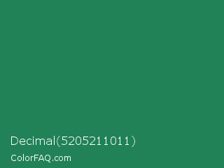 Decimal 5205211011 Color is a normal green color and the nearest color is Eucalyptus #278a5b. Hex code #218257 and RGB value is rgb(33,130,87). In RGB color space, this color is composed of 13% red, 51% green, 34% blue, In CMYK color space, this color is composed of 75% cyan, 0% magenta, 33% yellow , 49% black , In HSL color space, this color has a hue angle of 153° , 60% saturation and 32% lightness.