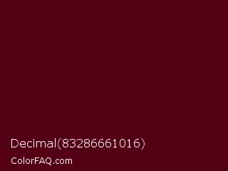 Decimal 83286661016 Color is a very dark red color and the nearest color is Dark Scarlet #560319. Hex code #540116 and RGB value is rgb(84,1,22). In RGB color space, this color is composed of 33% red, 0% green, 9% blue, In CMYK color space, this color is composed of 0% cyan, 99% magenta, 74% yellow , 67% black , In HSL color space, this color has a hue angle of 345° , 98% saturation and 17% lightness.