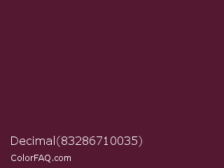 Decimal 83286710035 Color is a very dark rose color and the nearest color is Wine Berry #591d35. Hex code #541831 and RGB value is rgb(84,24,49). In RGB color space, this color is composed of 33% red, 9% green, 19% blue, In CMYK color space, this color is composed of 0% cyan, 71% magenta, 42% yellow , 67% black , In HSL color space, this color has a hue angle of 335° , 56% saturation and 21% lightness.