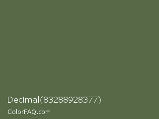 Decimal 83288928377 Color is a normal green color and the nearest color is Axolotl #4e6649. Hex code #576947 and RGB value is rgb(87,105,71). In RGB color space, this color is composed of 34% red, 41% green, 28% blue, In CMYK color space, this color is composed of 17% cyan, 0% magenta, 32% yellow , 59% black , In HSL color space, this color has a hue angle of 92° , 19% saturation and 35% lightness.