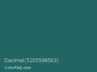 Decimal 5205598563 Color is a dark cyan color and the nearest color is Casal #2f6168. Hex code #226663 and RGB value is rgb(34,102,99). In RGB color space, this color is composed of 13% red, 40% green, 39% blue, In CMYK color space, this color is composed of 67% cyan, 0% magenta, 3% yellow , 60% black , In HSL color space, this color has a hue angle of 177° , 50% saturation and 27% lightness.