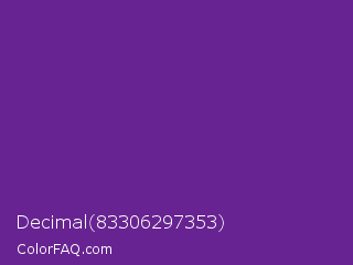 Decimal 83306297353 Color is a normal purple color and the nearest color is Seance #731e8f. Hex code #672391 and RGB value is rgb(103,35,145). In RGB color space, this color is composed of 40% red, 14% green, 57% blue, In CMYK color space, this color is composed of 29% cyan, 76% magenta, 0% yellow , 43% black , In HSL color space, this color has a hue angle of 277° , 61% saturation and 35% lightness.