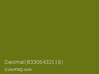 Decimal 83306432116 Color is a dark yellow color and the nearest color is Olivetone #716e10. Hex code #677512 and RGB value is rgb(103,117,18). In RGB color space, this color is composed of 40% red, 46% green, 7% blue, In CMYK color space, this color is composed of 12% cyan, 0% magenta, 85% yellow , 54% black , In HSL color space, this color has a hue angle of 68° , 73% saturation and 26% lightness.
