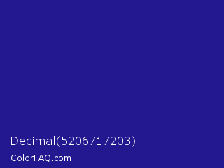 Decimal 5206717203 Color is a normal indigo color and the nearest color is Jacksons Purple #20208d. Hex code #241891 and RGB value is rgb(36,24,145). In RGB color space, this color is composed of 14% red, 9% green, 57% blue, In CMYK color space, this color is composed of 75% cyan, 83% magenta, 0% yellow , 43% black , In HSL color space, this color has a hue angle of 246° , 72% saturation and 33% lightness.