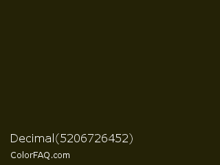 Decimal 5206726452 Color is a almost black yellow color and the nearest color is Cannon Black #251706. Hex code #242206 and RGB value is rgb(36,34,6). In RGB color space, this color is composed of 14% red, 13% green, 2% blue, In CMYK color space, this color is composed of 0% cyan, 6% magenta, 83% yellow , 86% black , In HSL color space, this color has a hue angle of 56° , 71% saturation and 8% lightness.