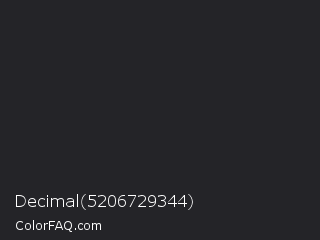 Decimal 5206729344 Color is a very dark blue color and the nearest color is Raisin Black #242124. Hex code #242428 and RGB value is rgb(36,36,40). In RGB color space, this color is composed of 14% red, 14% green, 16% blue, In CMYK color space, this color is composed of 10% cyan, 10% magenta, 0% yellow , 84% black , In HSL color space, this color has a hue angle of 240° , 5% saturation and 15% lightness.