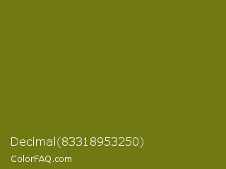 Decimal 83318953250 Color is a dark yellow color and the nearest color is Olivetone #716e10. Hex code #707912 and RGB value is rgb(112,121,18). In RGB color space, this color is composed of 44% red, 47% green, 7% blue, In CMYK color space, this color is composed of 7% cyan, 0% magenta, 85% yellow , 53% black , In HSL color space, this color has a hue angle of 65° , 74% saturation and 27% lightness.