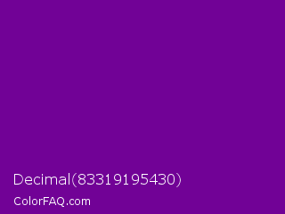 Decimal 83319195430 Color is a dark purple color and the nearest color is Purple #660099. Hex code #710296 and RGB value is rgb(113,2,150). In RGB color space, this color is composed of 44% red, 1% green, 59% blue, In CMYK color space, this color is composed of 25% cyan, 99% magenta, 0% yellow , 41% black , In HSL color space, this color has a hue angle of 285° , 97% saturation and 30% lightness.