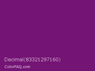 Decimal 83321297160 Color is a dark magenta color and the nearest color is Midnight #702670. Hex code #741474 and RGB value is rgb(116,20,116). In RGB color space, this color is composed of 45% red, 8% green, 45% blue, In CMYK color space, this color is composed of 0% cyan, 83% magenta, 0% yellow , 55% black , In HSL color space, this color has a hue angle of 300° , 71% saturation and 27% lightness.