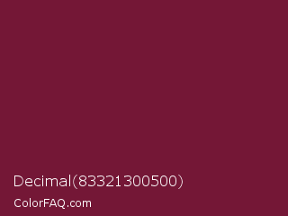Decimal 83321300500 Color is a dark rose color and the nearest color is Claret #7f1734. Hex code #741736 and RGB value is rgb(116,23,54). In RGB color space, this color is composed of 45% red, 9% green, 21% blue, In CMYK color space, this color is composed of 0% cyan, 80% magenta, 53% yellow , 55% black , In HSL color space, this color has a hue angle of 340° , 67% saturation and 27% lightness.