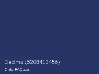 Decimal 5208413456 Color is a dark blue color and the nearest color is Biscay #1b3162. Hex code #263466 and RGB value is rgb(38,52,102). In RGB color space, this color is composed of 15% red, 20% green, 40% blue, In CMYK color space, this color is composed of 63% cyan, 49% magenta, 0% yellow , 60% black , In HSL color space, this color has a hue angle of 227° , 46% saturation and 27% lightness.