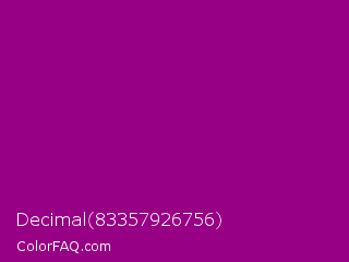 Decimal 83357926756 Color is a dark magenta color and the nearest color is Dark Magenta #8b008b. Hex code #970084 and RGB value is rgb(151,0,132). In RGB color space, this color is composed of 59% red, 0% green, 52% blue, In CMYK color space, this color is composed of 0% cyan, 100% magenta, 13% yellow , 41% black , In HSL color space, this color has a hue angle of 308° , 100% saturation and 30% lightness.