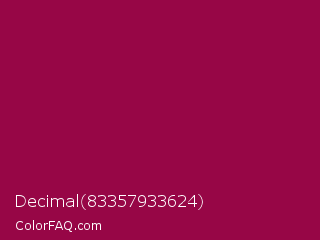 Decimal 83357933624 Color is a normal rose color and the nearest color is Pink Raspberry #980036. Hex code #970646 and RGB value is rgb(151,6,70). In RGB color space, this color is composed of 59% red, 2% green, 27% blue, In CMYK color space, this color is composed of 0% cyan, 96% magenta, 54% yellow , 41% black , In HSL color space, this color has a hue angle of 334° , 92% saturation and 31% lightness.