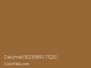 Decimal 83358917520 Color is a normal orange color and the nearest color is Coconut #965a3e. Hex code #986736 and RGB value is rgb(152,103,54). In RGB color space, this color is composed of 60% red, 40% green, 21% blue, In CMYK color space, this color is composed of 0% cyan, 32% magenta, 64% yellow , 40% black , In HSL color space, this color has a hue angle of 30° , 48% saturation and 40% lightness.