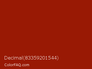 Decimal 83359201544 Color is a normal red color and the nearest color is Totem Pole #991b07. Hex code #991904 and RGB value is rgb(153,25,4). In RGB color space, this color is composed of 60% red, 10% green, 2% blue, In CMYK color space, this color is composed of 0% cyan, 84% magenta, 97% yellow , 40% black , In HSL color space, this color has a hue angle of 8° , 95% saturation and 31% lightness.