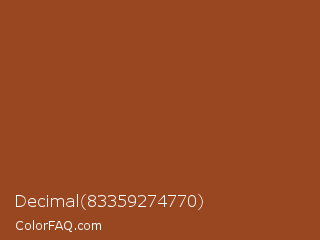 Decimal 83359274770 Color is a normal orange color and the nearest color is Cumin #924321. Hex code #994720 and RGB value is rgb(153,71,32). In RGB color space, this color is composed of 60% red, 28% green, 13% blue, In CMYK color space, this color is composed of 0% cyan, 54% magenta, 79% yellow , 40% black , In HSL color space, this color has a hue angle of 19° , 65% saturation and 36% lightness.