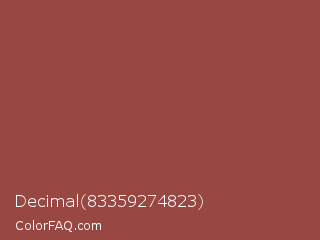 Decimal 83359274823 Color is a normal red color and the nearest color is Copper Rust #944747. Hex code #994743 and RGB value is rgb(153,71,67). In RGB color space, this color is composed of 60% red, 28% green, 26% blue, In CMYK color space, this color is composed of 0% cyan, 54% magenta, 56% yellow , 40% black , In HSL color space, this color has a hue angle of 3° , 39% saturation and 43% lightness.