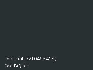Decimal 5210468418 Color is a very dark cyan color and the nearest color is Gunmetal #2a3439. Hex code #293032 and RGB value is rgb(41,48,50). In RGB color space, this color is composed of 16% red, 19% green, 20% blue, In CMYK color space, this color is composed of 18% cyan, 4% magenta, 0% yellow , 80% black , In HSL color space, this color has a hue angle of 193° , 10% saturation and 18% lightness.