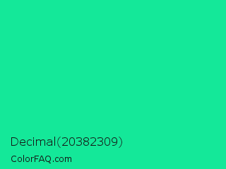 Decimal 20382309 Color is a normal green color and the nearest color is Medium Spring Green #00fa9a. Hex code #14e899 and RGB value is rgb(20,232,153). In RGB color space, this color is composed of 8% red, 91% green, 60% blue, In CMYK color space, this color is composed of 91% cyan, 0% magenta, 34% yellow , 9% black , In HSL color space, this color has a hue angle of 158° , 84% saturation and 49% lightness.