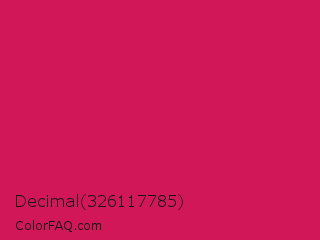 Decimal 326117785 Color is a normal rose color and the nearest color is Debian Red #d70a53. Hex code #d11757 and RGB value is rgb(209,23,87). In RGB color space, this color is composed of 82% red, 9% green, 34% blue, In CMYK color space, this color is composed of 0% cyan, 89% magenta, 58% yellow , 18% black , In HSL color space, this color has a hue angle of 339° , 80% saturation and 45% lightness.
