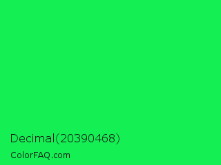 Decimal 20390468 Color is a normal green color and the nearest color is Malachite #0bda51. Hex code #14f054 and RGB value is rgb(20,240,84). In RGB color space, this color is composed of 8% red, 94% green, 33% blue, In CMYK color space, this color is composed of 92% cyan, 0% magenta, 65% yellow , 6% black , In HSL color space, this color has a hue angle of 137° , 88% saturation and 51% lightness.
