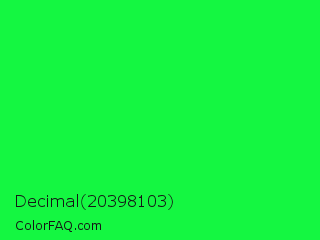 Decimal 20398103 Color is a normal green color and the nearest color is Malachite #0bda51. Hex code #14f741 and RGB value is rgb(20,247,65). In RGB color space, this color is composed of 8% red, 97% green, 25% blue, In CMYK color space, this color is composed of 92% cyan, 0% magenta, 74% yellow , 3% black , In HSL color space, this color has a hue angle of 132° , 93% saturation and 52% lightness.