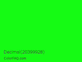 Decimal 20399928 Color is a normal green color and the nearest color is Green #00ff00. Hex code #14fa12 and RGB value is rgb(20,250,18). In RGB color space, this color is composed of 8% red, 98% green, 7% blue, In CMYK color space, this color is composed of 92% cyan, 0% magenta, 93% yellow , 2% black , In HSL color space, this color has a hue angle of 119° , 96% saturation and 53% lightness.