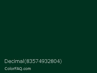 Decimal 83574932804 Color is a very dark green color and the nearest color is Dark Green #013220. Hex code #003220 and RGB value is rgb(0,50,32). In RGB color space, this color is composed of 0% red, 20% green, 13% blue, In CMYK color space, this color is composed of 100% cyan, 0% magenta, 36% yellow , 80% black , In HSL color space, this color has a hue angle of 158° , 100% saturation and 10% lightness.