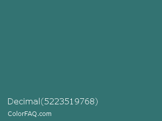 Decimal 5223519768 Color is a normal cyan color and the nearest color is Oracle #377475. Hex code #337372 and RGB value is rgb(51,115,114). In RGB color space, this color is composed of 20% red, 45% green, 45% blue, In CMYK color space, this color is composed of 56% cyan, 0% magenta, 1% yellow , 55% black , In HSL color space, this color has a hue angle of 179° , 39% saturation and 33% lightness.