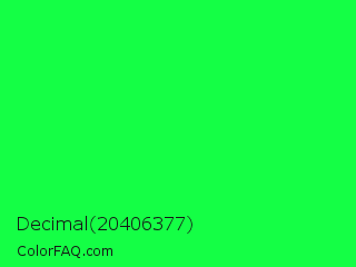 Decimal 20406377 Color is a normal green color and the nearest color is Malachite #0bda51. Hex code #14ff45 and RGB value is rgb(20,255,69). In RGB color space, this color is composed of 8% red, 100% green, 27% blue, In CMYK color space, this color is composed of 92% cyan, 0% magenta, 73% yellow , 0% black , In HSL color space, this color has a hue angle of 133° , 100% saturation and 54% lightness.