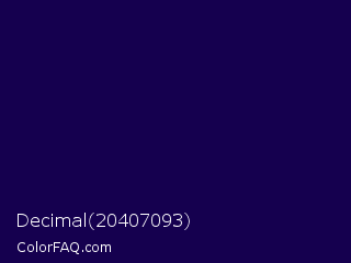 Decimal 20407093 Color is a very dark indigo color and the nearest color is Tolopea #1b0245. Hex code #15004f and RGB value is rgb(21,0,79). In RGB color space, this color is composed of 8% red, 0% green, 31% blue, In CMYK color space, this color is composed of 73% cyan, 100% magenta, 0% yellow , 69% black , In HSL color space, this color has a hue angle of 256° , 100% saturation and 15% lightness.