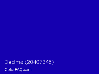 Decimal 20407346 Color is a normal indigo color and the nearest color is Duke Blue #00009c. Hex code #1500b0 and RGB value is rgb(21,0,176). In RGB color space, this color is composed of 8% red, 0% green, 69% blue, In CMYK color space, this color is composed of 88% cyan, 100% magenta, 0% yellow , 31% black , In HSL color space, this color has a hue angle of 247° , 100% saturation and 35% lightness.
