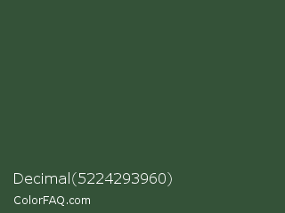 Decimal 5224293960 Color is a dark green color and the nearest color is Lunar Green #3c493a. Hex code #345238 and RGB value is rgb(52,82,56). In RGB color space, this color is composed of 20% red, 32% green, 22% blue, In CMYK color space, this color is composed of 37% cyan, 0% magenta, 32% yellow , 68% black , In HSL color space, this color has a hue angle of 128° , 22% saturation and 26% lightness.