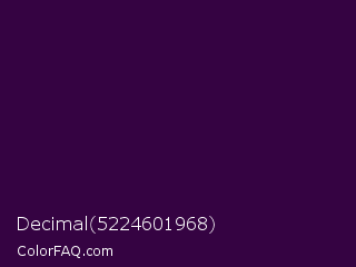 Decimal 5224601968 Color is a very dark purple color and the nearest color is Valentino #350e42. Hex code #350342 and RGB value is rgb(53,3,66). In RGB color space, this color is composed of 21% red, 1% green, 26% blue, In CMYK color space, this color is composed of 20% cyan, 95% magenta, 0% yellow , 74% black , In HSL color space, this color has a hue angle of 288° , 91% saturation and 14% lightness.