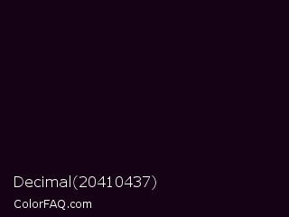 Decimal 20410437 Color is a almost black magenta color and the nearest color is Black Russian #0a001c. Hex code #150315 and RGB value is rgb(21,3,21). In RGB color space, this color is composed of 8% red, 1% green, 8% blue, In CMYK color space, this color is composed of 0% cyan, 86% magenta, 0% yellow , 92% black , In HSL color space, this color has a hue angle of 300° , 75% saturation and 5% lightness.