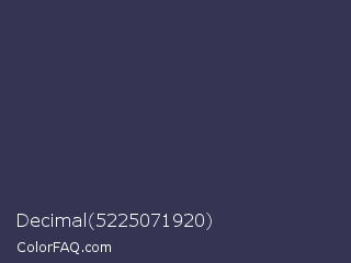 Decimal 5225071920 Color is a dark indigo color and the nearest color is Martinique #363050. Hex code #353452 and RGB value is rgb(53,52,82). In RGB color space, this color is composed of 21% red, 20% green, 32% blue, In CMYK color space, this color is composed of 35% cyan, 37% magenta, 0% yellow , 68% black , In HSL color space, this color has a hue angle of 242° , 22% saturation and 26% lightness.