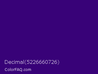 Decimal 5226660726 Color is a dark violet color and the nearest color is Blue Diamond #380474. Hex code #380278 and RGB value is rgb(56,2,120). In RGB color space, this color is composed of 22% red, 1% green, 47% blue, In CMYK color space, this color is composed of 53% cyan, 98% magenta, 0% yellow , 53% black , In HSL color space, this color has a hue angle of 267° , 97% saturation and 24% lightness.