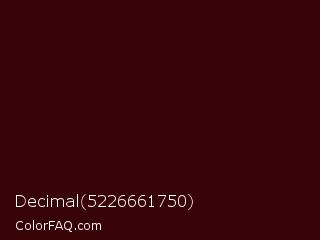 Decimal 5226661750 Color is a very dark red color and the nearest color is Temptress #3b000b. Hex code #380408 and RGB value is rgb(56,4,8). In RGB color space, this color is composed of 22% red, 2% green, 3% blue, In CMYK color space, this color is composed of 0% cyan, 93% magenta, 86% yellow , 78% black , In HSL color space, this color has a hue angle of 355° , 87% saturation and 12% lightness.