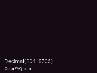 Decimal 20418706 Color is a almost black magenta color and the nearest color is Cinder #0e0e18. Hex code #150b14 and RGB value is rgb(21,11,20). In RGB color space, this color is composed of 8% red, 4% green, 8% blue, In CMYK color space, this color is composed of 0% cyan, 48% magenta, 5% yellow , 92% black , In HSL color space, this color has a hue angle of 306° , 31% saturation and 6% lightness.