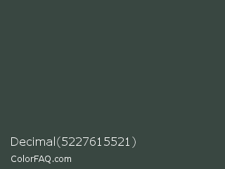 Decimal 5227615521 Color is a dark green color and the nearest color is Cape Cod #3c4443. Hex code #394741 and RGB value is rgb(57,71,65). In RGB color space, this color is composed of 22% red, 28% green, 25% blue, In CMYK color space, this color is composed of 20% cyan, 0% magenta, 8% yellow , 72% black , In HSL color space, this color has a hue angle of 154° , 11% saturation and 25% lightness.