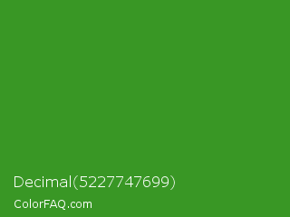 Decimal 5227747699 Color is a normal green color and the nearest color is Slimy Green #299617. Hex code #399725 and RGB value is rgb(57,151,37). In RGB color space, this color is composed of 22% red, 59% green, 15% blue, In CMYK color space, this color is composed of 62% cyan, 0% magenta, 75% yellow , 41% black , In HSL color space, this color has a hue angle of 109° , 61% saturation and 37% lightness.