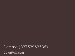 Decimal 83753963536 Color is a dark red color and the nearest color is Woody Brown #483131. Hex code #443232 and RGB value is rgb(68,50,50). In RGB color space, this color is composed of 27% red, 20% green, 20% blue, In CMYK color space, this color is composed of 0% cyan, 26% magenta, 26% yellow , 73% black , In HSL color space, this color has a hue angle of 0° , 15% saturation and 23% lightness.