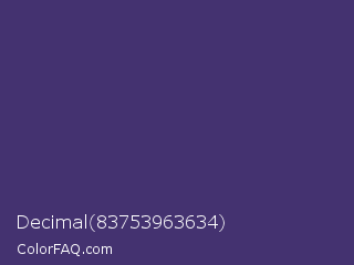 Decimal 83753963634 Color is a normal indigo color and the nearest color is Jacarta #3a2a6a. Hex code #443270 and RGB value is rgb(68,50,112). In RGB color space, this color is composed of 27% red, 20% green, 44% blue, In CMYK color space, this color is composed of 39% cyan, 55% magenta, 0% yellow , 56% black , In HSL color space, this color has a hue angle of 257° , 38% saturation and 32% lightness.