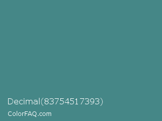 Decimal 83754517393 Color is a normal cyan color and the nearest color is Smalt Blue #51808f. Hex code #458787 and RGB value is rgb(69,135,135). In RGB color space, this color is composed of 27% red, 53% green, 53% blue, In CMYK color space, this color is composed of 49% cyan, 0% magenta, 0% yellow , 47% black , In HSL color space, this color has a hue angle of 180° , 32% saturation and 40% lightness.