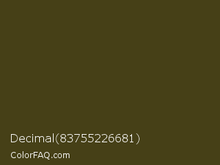Decimal 83755226681 Color is a very dark yellow color and the nearest color is Thatch Green #403d19. Hex code #464017 and RGB value is rgb(70,64,23). In RGB color space, this color is composed of 27% red, 25% green, 9% blue, In CMYK color space, this color is composed of 0% cyan, 9% magenta, 67% yellow , 73% black , In HSL color space, this color has a hue angle of 52° , 51% saturation and 18% lightness.