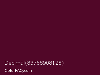 Decimal 83768908128 Color is a very dark rose color and the nearest color is Castro #52001f. Hex code #510728 and RGB value is rgb(81,7,40). In RGB color space, this color is composed of 32% red, 3% green, 16% blue, In CMYK color space, this color is composed of 0% cyan, 91% magenta, 51% yellow , 68% black , In HSL color space, this color has a hue angle of 333° , 84% saturation and 17% lightness.