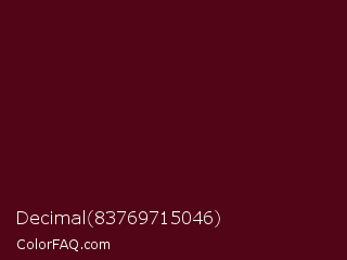 Decimal 83769715046 Color is a very dark red color and the nearest color is Dark Scarlet #560319. Hex code #520516 and RGB value is rgb(82,5,22). In RGB color space, this color is composed of 32% red, 2% green, 9% blue, In CMYK color space, this color is composed of 0% cyan, 94% magenta, 73% yellow , 68% black , In HSL color space, this color has a hue angle of 347° , 89% saturation and 17% lightness.
