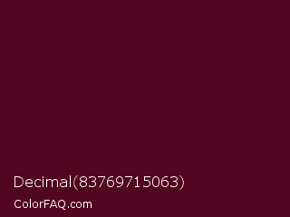 Decimal 83769715063 Color is a very dark rose color and the nearest color is Castro #52001f. Hex code #520521 and RGB value is rgb(82,5,33). In RGB color space, this color is composed of 32% red, 2% green, 13% blue, In CMYK color space, this color is composed of 0% cyan, 94% magenta, 60% yellow , 68% black , In HSL color space, this color has a hue angle of 338° , 89% saturation and 17% lightness.